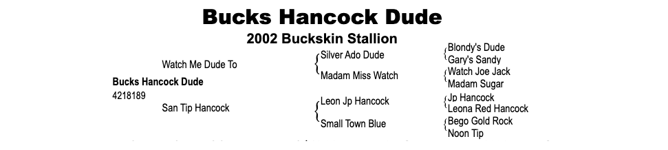 Bucks Hancock Dude, a 2002 buckskin stallion, has made significant contributions to the performance horse industry, particularly in tie-down roping. Sired by Watch Me Dude To and out of San Tip Hancock (by Leon JP Hancock), he boasts a lineage rich in performance excellence.